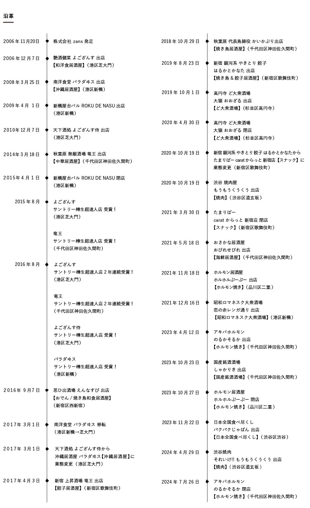 私たち株式会社 zansは、100店舗100年経営を目標に、現在新宿、渋谷、秋葉原、新橋、大門・浜松町で居酒屋を運営しています!15年前、経営者になるには実戦で経営を学ぶことが、最速の成長と考えた私は、飲食業界で2年修行してzansを立上げました。10年苦労の連続でしたが、100店舗つくる実力をつける為に、常にバラバラの業態に挑戦し10店舗10業態のお店が出来ました。次はzansの仲間達と2年半で10店舗立上げ、お客様に褒められ、叱られながら学ぶ究極のOJTで最高のサービスとは何か?おいしい料理とは何か?を追求する100人の仲間をつくります。私達は、Zealous Attitude Never Sink(決して負けない熱心な姿勢) をプライドに夢を応援、実現する集団です。